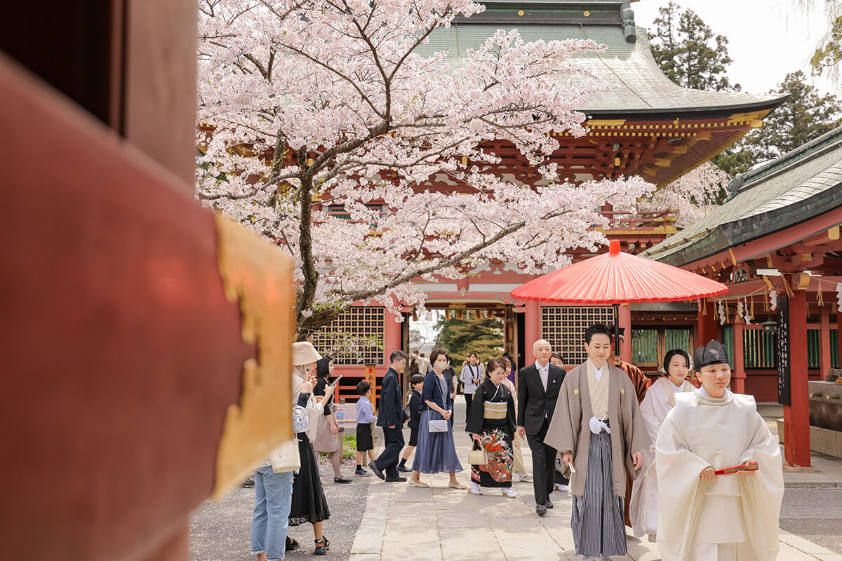 全国各地にある鹽竈神社の総本社。東北鎮護・陸奥国一之宮として、古くから朝廷と藩主・伊達氏歴代をはじめ広く崇敬を集めてきました。本殿・拝殿・四足門ほかの社殿建築が国の重要文化財に指定されています。緑豊かな境内、参列者に見守られながら神前結婚式が叶います。