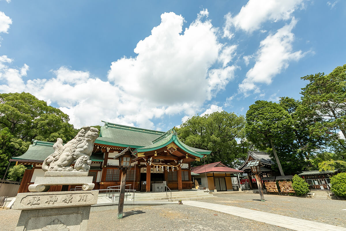 今から約1100年前に創建され、太陽、水、土の3柱の女神を祀られている神社の境内には、摂社、末社を合わせて11の社があり、川名弁天社は海上交通や道の守護神であり福の神、金運開運の神、音楽芸術の神、雄弁の神とさまざまなご利益が。狩野派の絵師・笙弘(しょうこう)が2年以上かけて描いた拝殿の天井絵は息をのむ美しさ。そんな「川原神社」で行われる結婚式は、伶人が奏でる格調高い雅楽に包まれた神前結婚式。厳粛な雰囲気のなか神前で巫女が舞う浦安の舞の様子は、古きよき日本の結婚式そのもの。四季折々にあわせた巫女の装いがふたりの挙式に華やかさを添えて。挙式後は緑豊かな境内で、参列者と記念撮影を。
