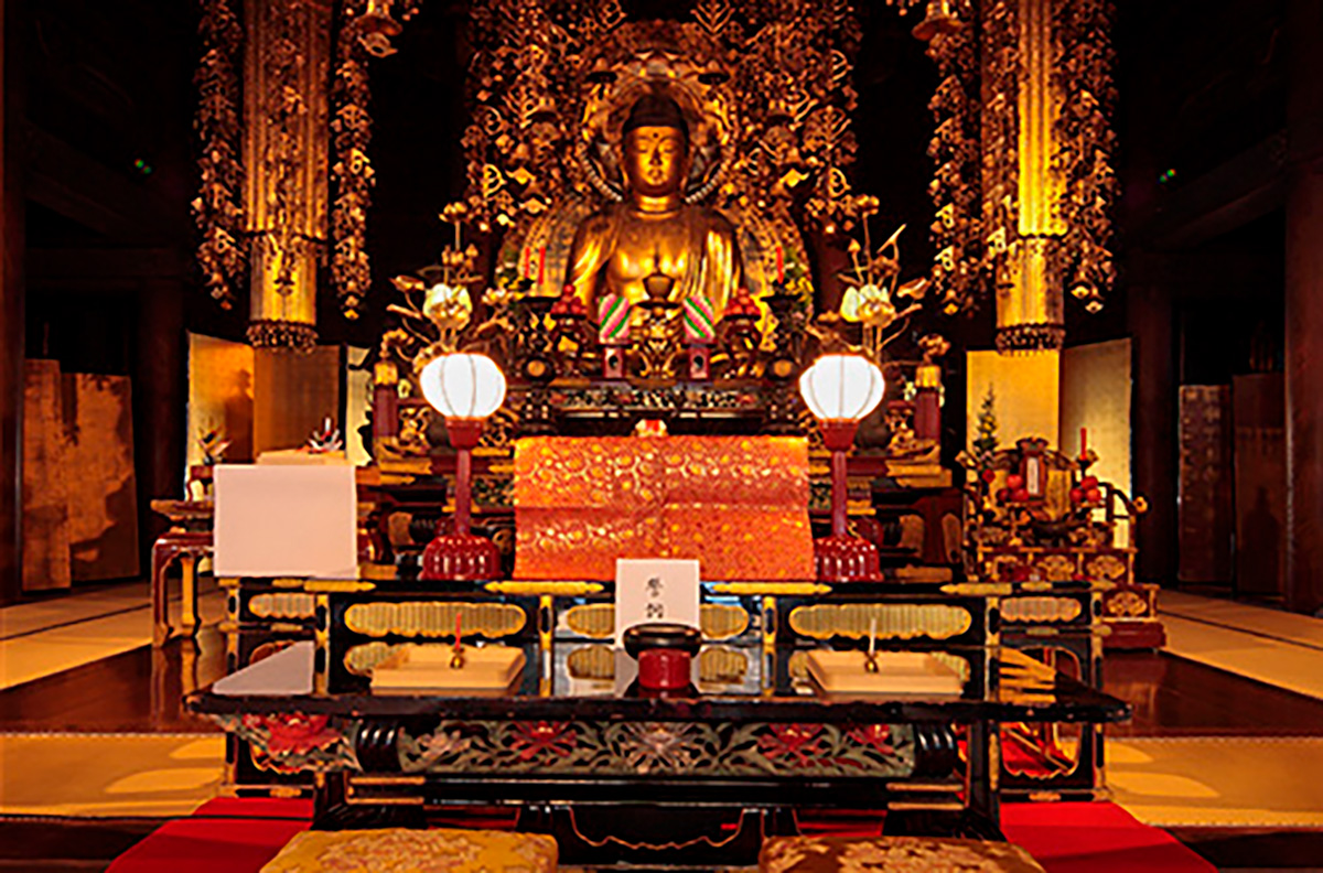 京都・東山三十六峰のひとつ華頂山のふもとに大伽藍がひろがる、浄土宗総本山「知恩院」。 承安5(1175)年に浄土宗の開祖・法然上人が吉水の地に草庵を結ばれたことにはじまり、法然上人が念仏の教えを広め、入寂された遺跡に建っています。日本最大級の楼門である国宝「三門」をはじめ数多くの文化財を有し、七不思議も魅力的な由緒ある寺院です。仏前結婚式では「行華(あんげ)の儀」を中心に、仏教の三宝に帰依する伝統的な儀式が執り行われます。先祖代々の位牌を祀る中、新たな家庭の船出を祝福する仏前式が叶います。「唱えれば誰もがひとりのこらず救われる」という教えの発祥の地にふさわしく、厳粛な中にもおおらかな雰囲気をたたえ、人々を迎え入れてきたお寺です。