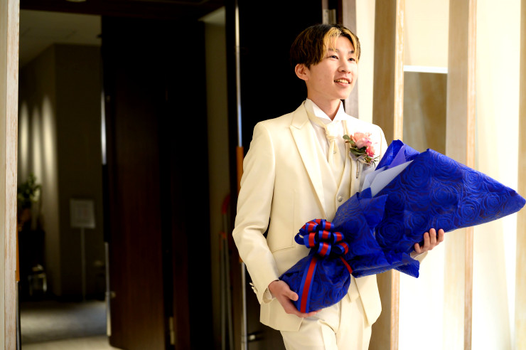 新婦様が先に待つチャペルの扉が開くとそこには、バラ40本とカスミソウ1本の花束を持つ新郎様の姿が
