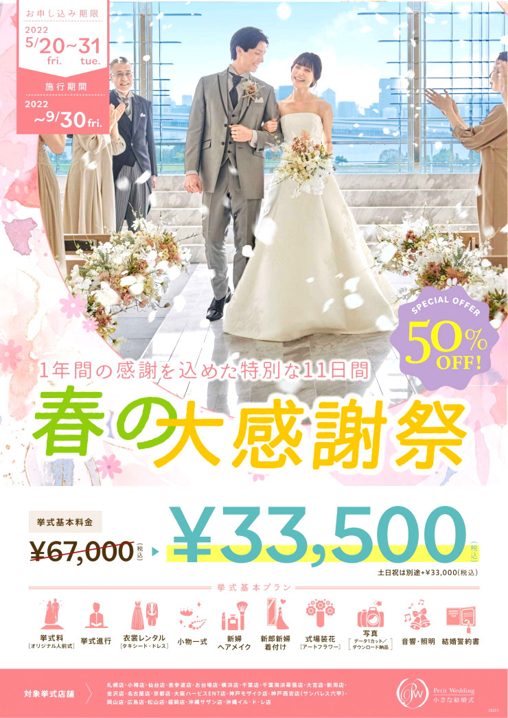 お得に結婚式が挙げられる、「挙式料金 半額 キャンペーン」となっております!!!
