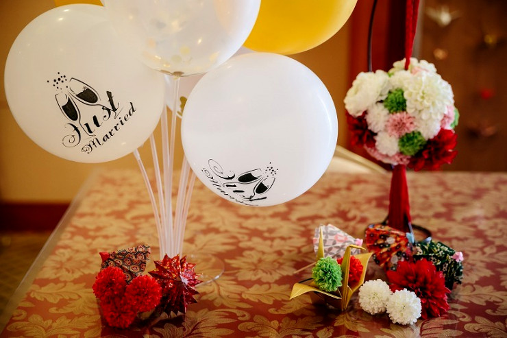 さらに、和の雰囲気を出してくれるダリアや和傘・折り紙風船で受付周りをより可愛らしく飾り付け♪