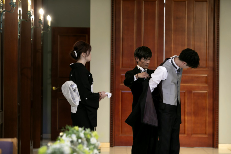 まずはお父様から、新郎様にジャケットを羽織らせていただきました。