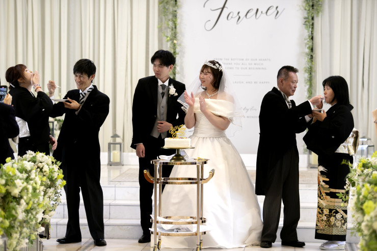 ケーキ入刀からお手本バイトまでの流れは、ご家族への感謝を伝えつつ、ゲストの皆さまにも楽しんでいただけるおすすめの演出です。