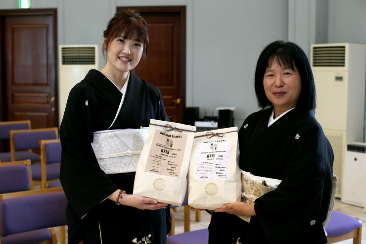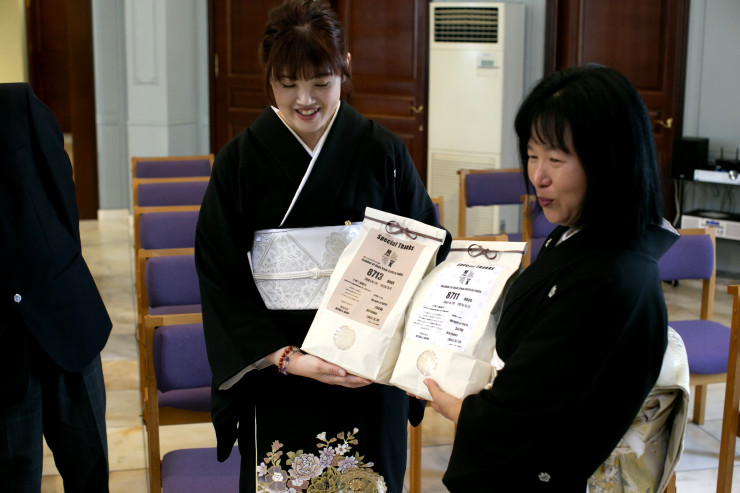 おふたりが誕生されたときの体重と同じ重さのお米を、かわいらしいパッケージにお包みしてご両親へお渡しいただきました。