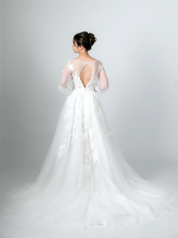 パールボタンが印象的なビショップスリーブに清楚なクラシカルさを思わせ、