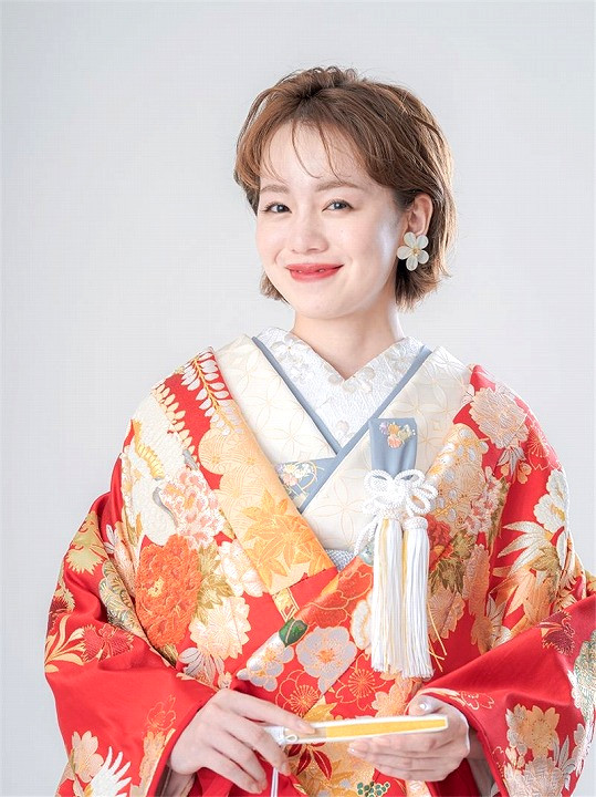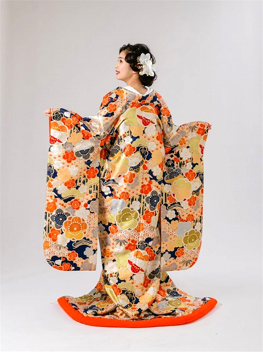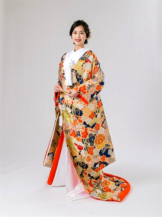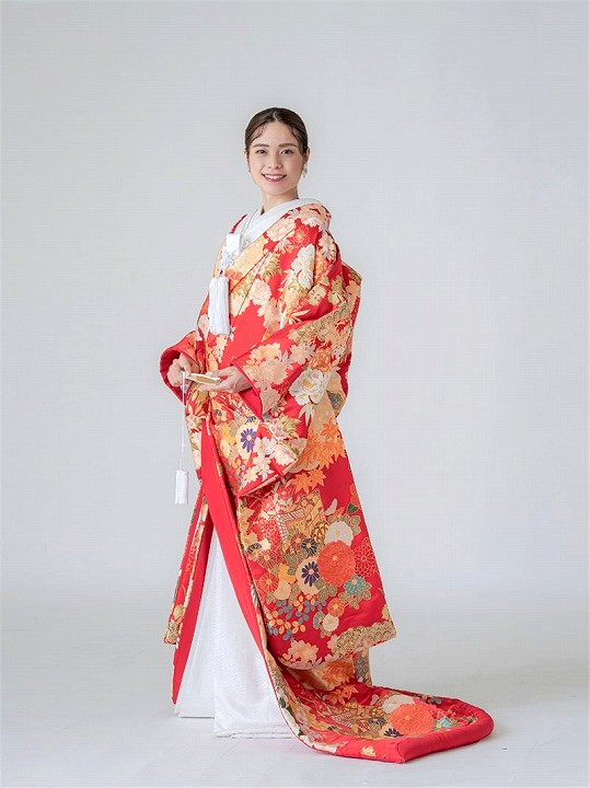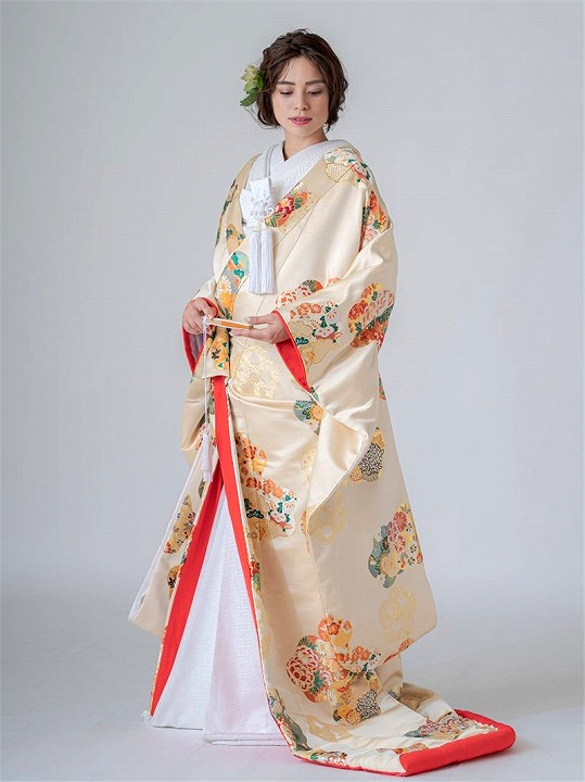雅やかな吉祥文様を描いた色打掛は、通年着用可能な西陣織の御婚礼衣装です。