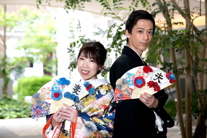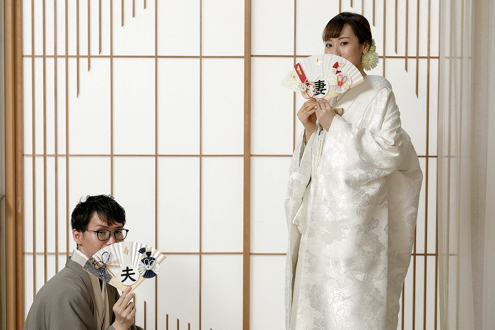 「夫」「妻」と書かれた手作り扇子でかわいらしいお写真も📸