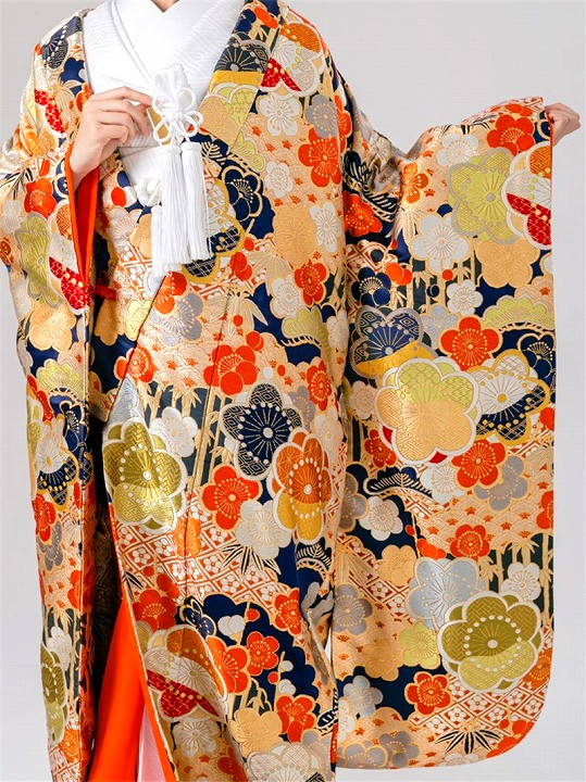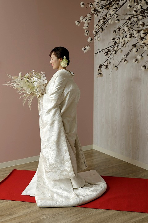 全体にすっきりと描かれた梅の花を伝統的な西陣織の技術を用いて丁寧に織り上げたご婚礼衣裳です。