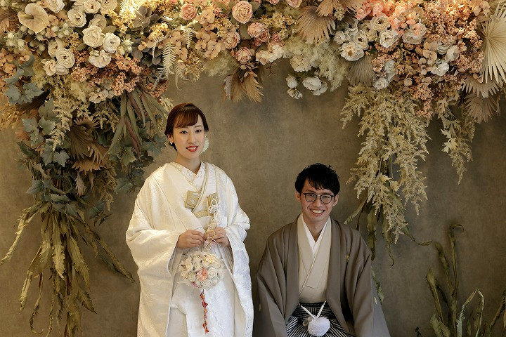 淡いお色味のお花が白無垢とベージュの紋付に合っていて