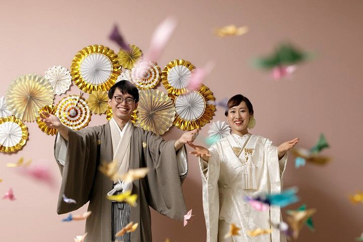 結びに和装に合わせた折り鶴シャワーを使って撮影✨