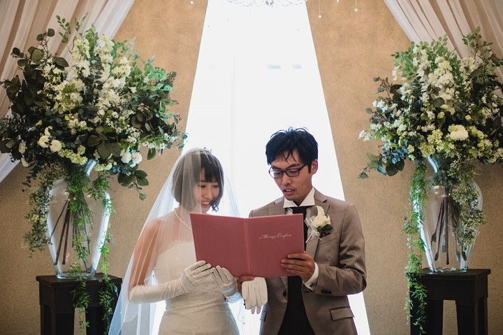 まずはお二人、大切なゲストの皆様の前で誓いを交わしていただきます