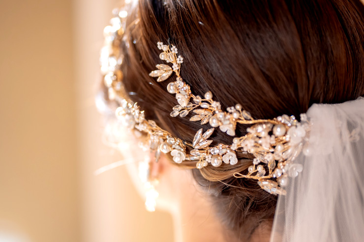 可愛い小物を身に着けメイクをしている楽しそうな新婦様。