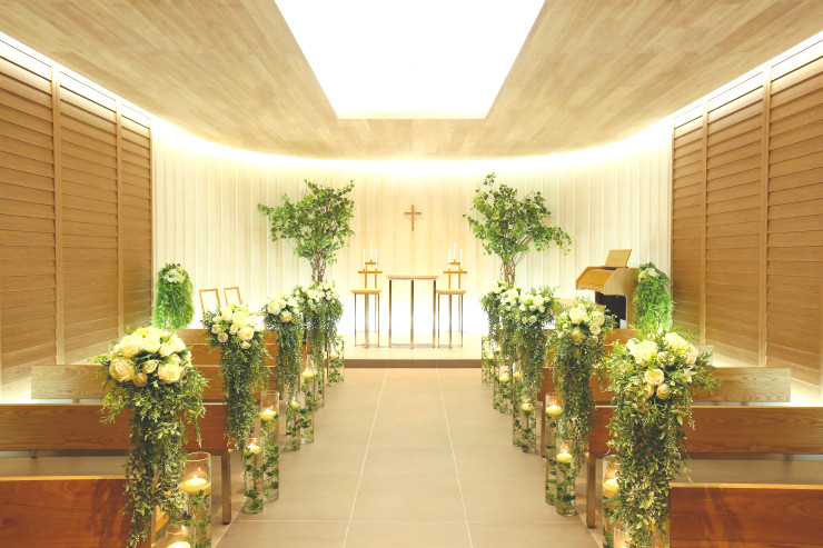 サイドの窓はステンドグラスで、キリスト教式にはピッタリ。