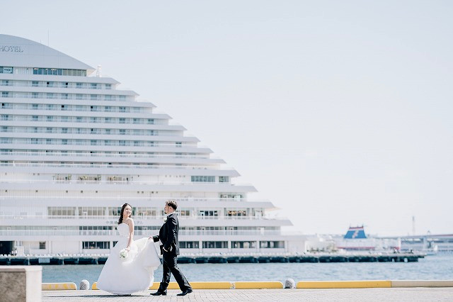 神戸店では、フォトでも結婚式でもハーバーランドの海を背景に素敵な写真が残ります!