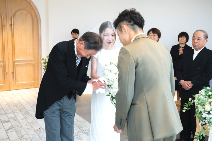お父様の手もそっとベールに添えられて、とても感動的なご家族とのワンシーンですね。
