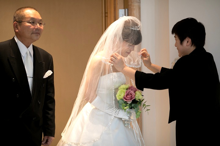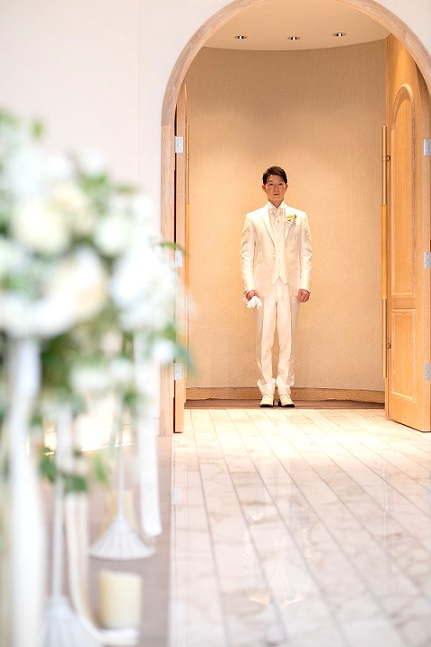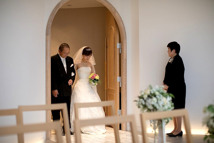 新郎様と新郎様の親御様の見守る中、ご新婦様はご入場