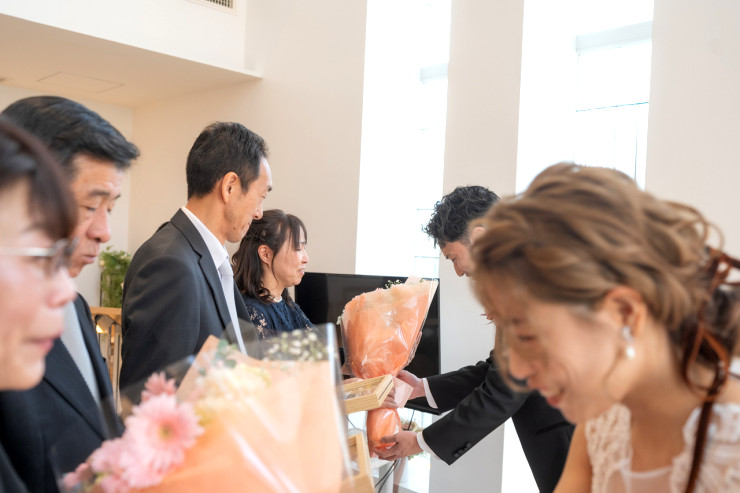 親御様にはお2人の前撮りの時のお写真を使用した記念品と花束をお渡しいたしました。