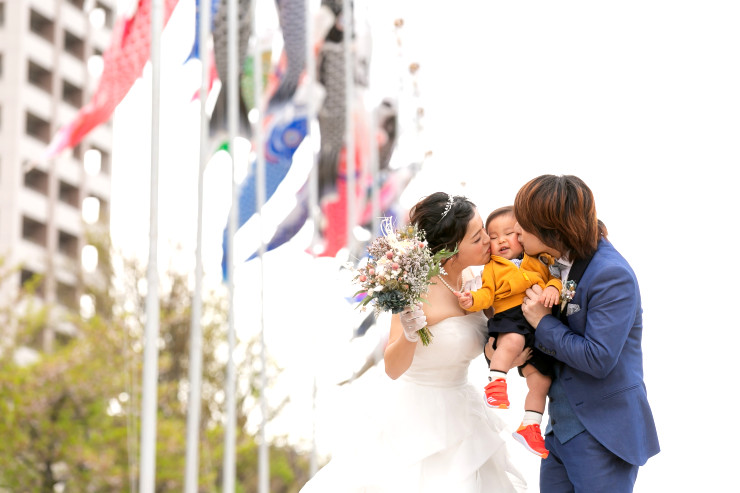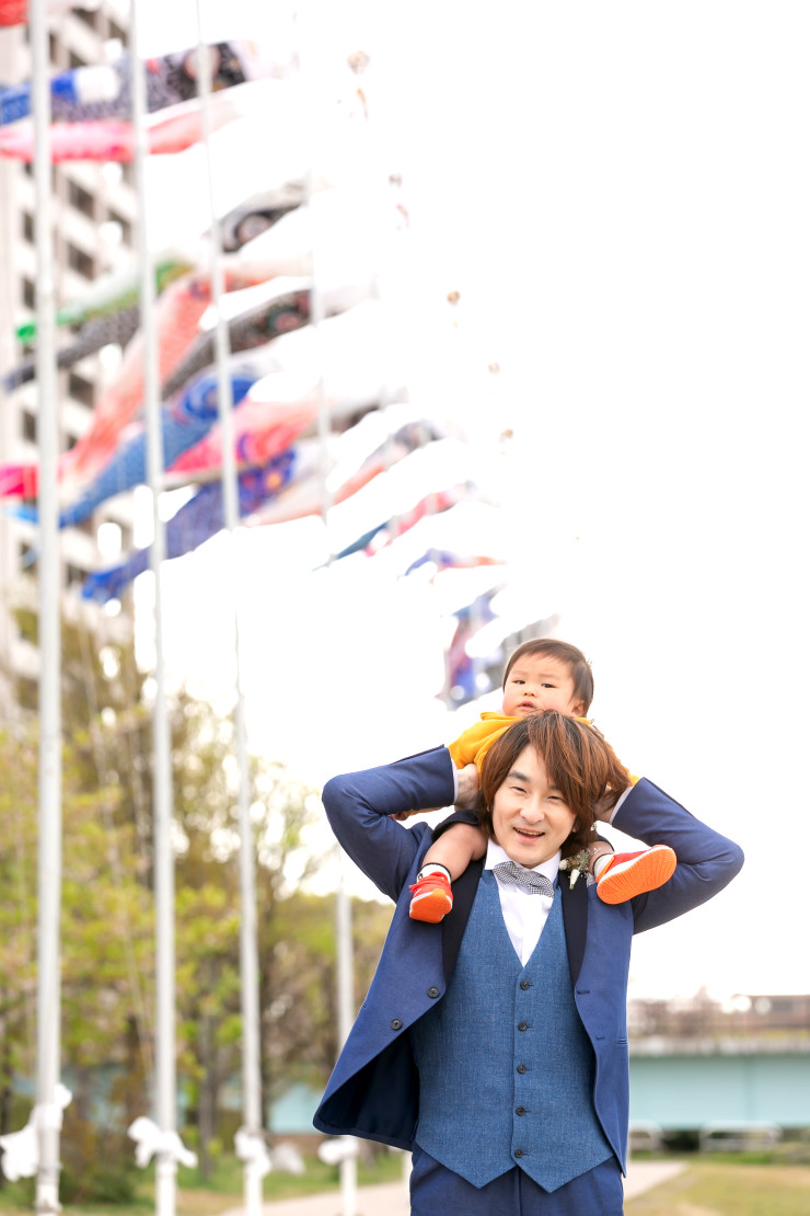 元気いっぱい泳ぐ鯉のぼりたちに負けないくらい元気いっぱいのお二人とお子様で、カメラマンもプランナーもずっとにこにこです^^