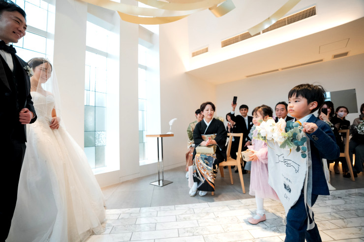 誓いの詞の後は新郎新婦も思わず笑顔になってしまったリングガールとフラックボーイの入場です!