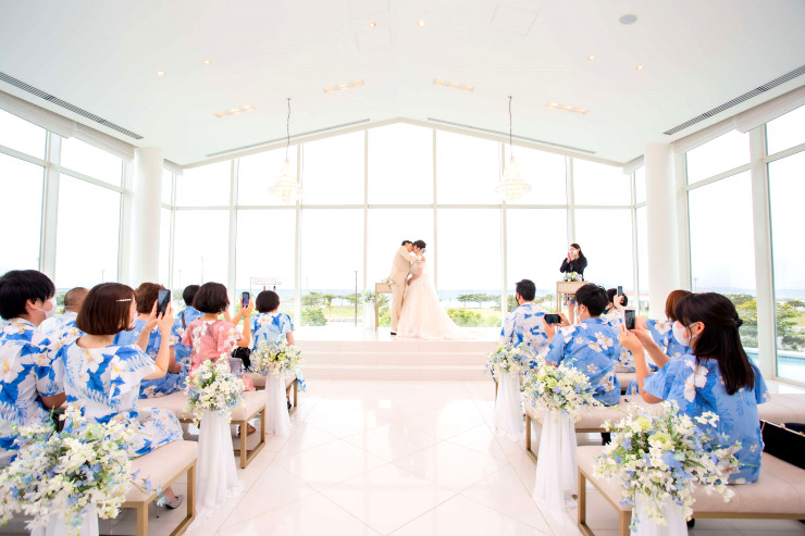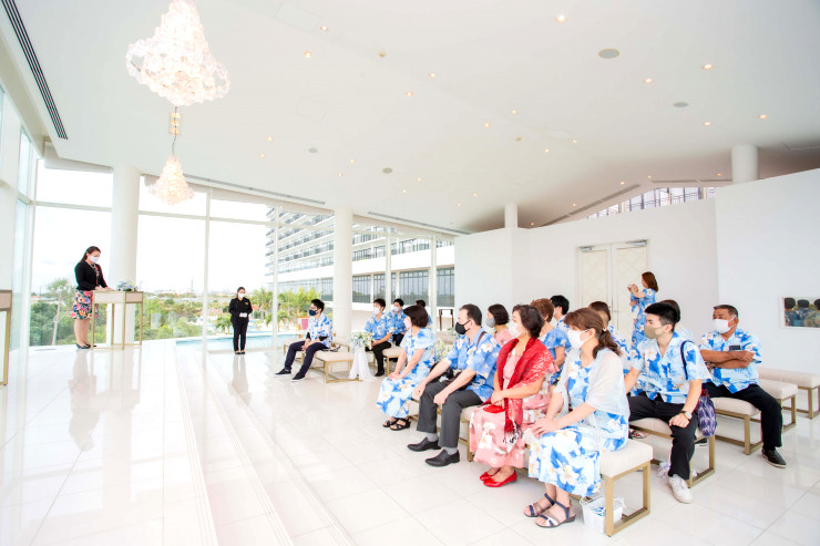 かりゆしウェアで揃えたゲストの皆さまが続々とご入場!