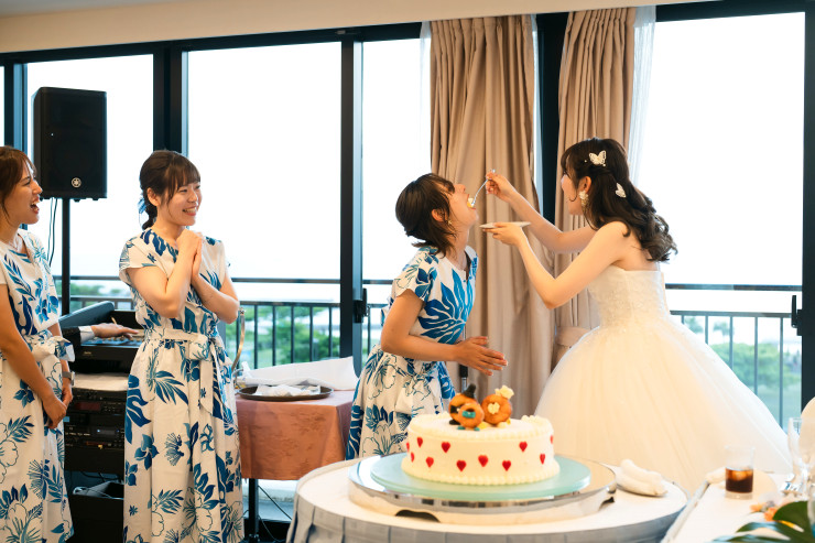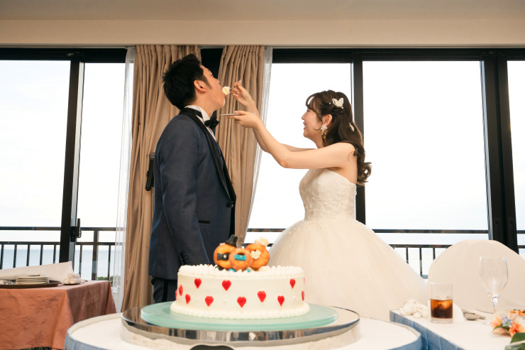 挙式中に生のケーキを用いてケーキ入用やファーストバイトなど
