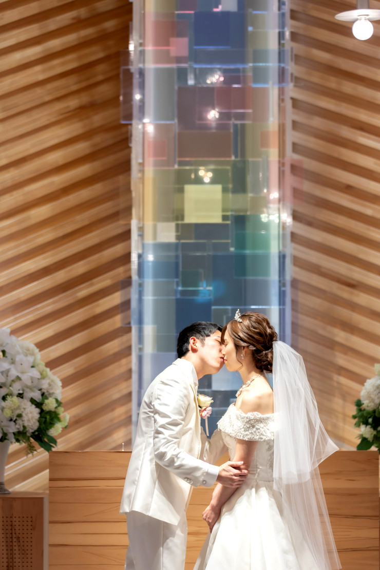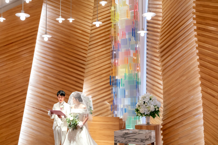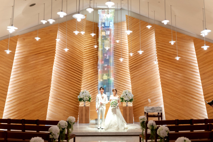 木のぬくもりと優しいステンドグラスに包まれる素敵なチャペルの中での挙式