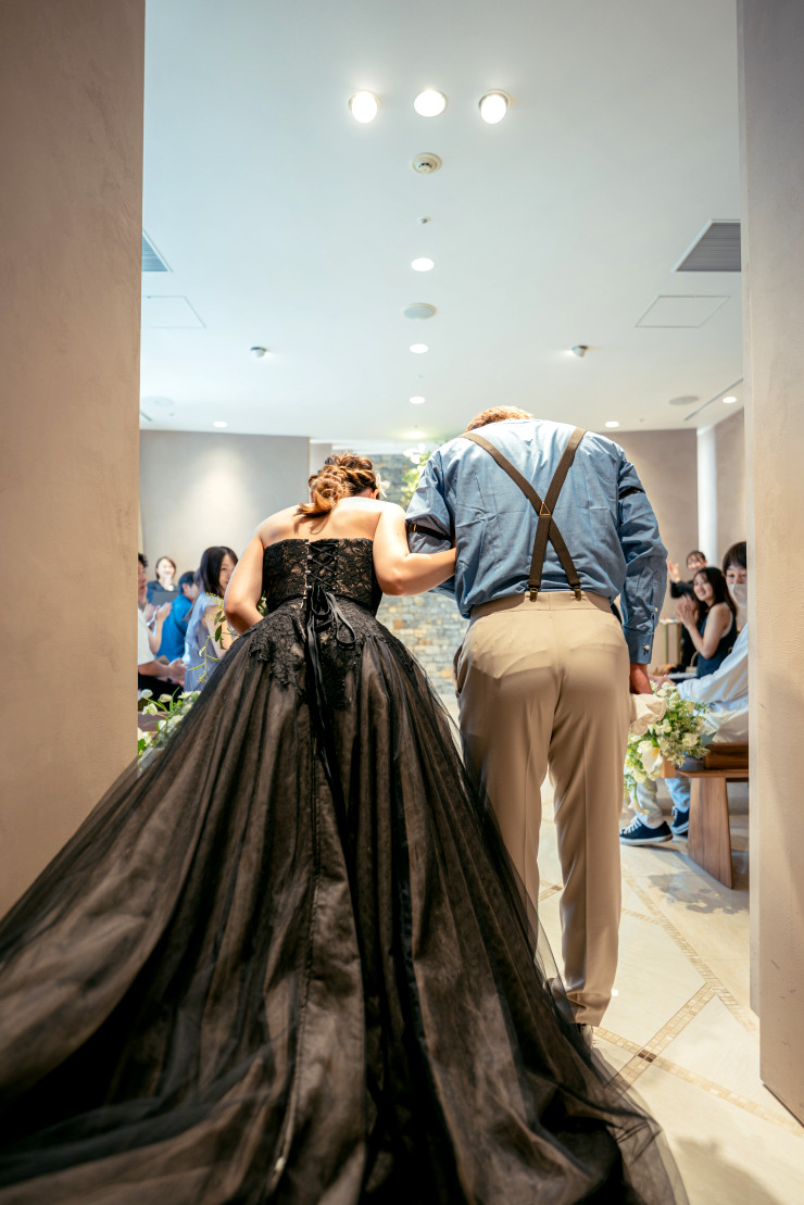 実は、、、この再入場、挙式から装い新たにブラックドレスを着用いただいてます!👗