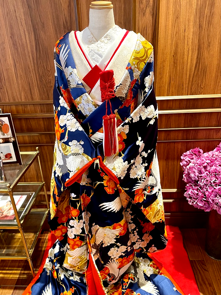 紺色ベースの色打掛に、着物の柄と合わせて小物を赤で統一したコーディネートです♪