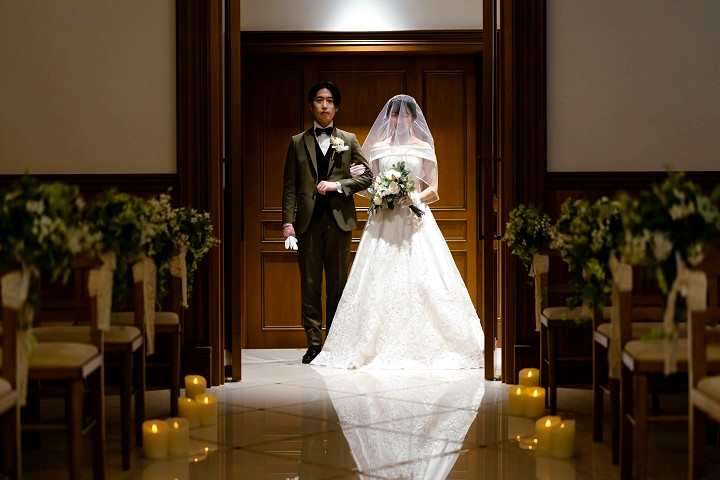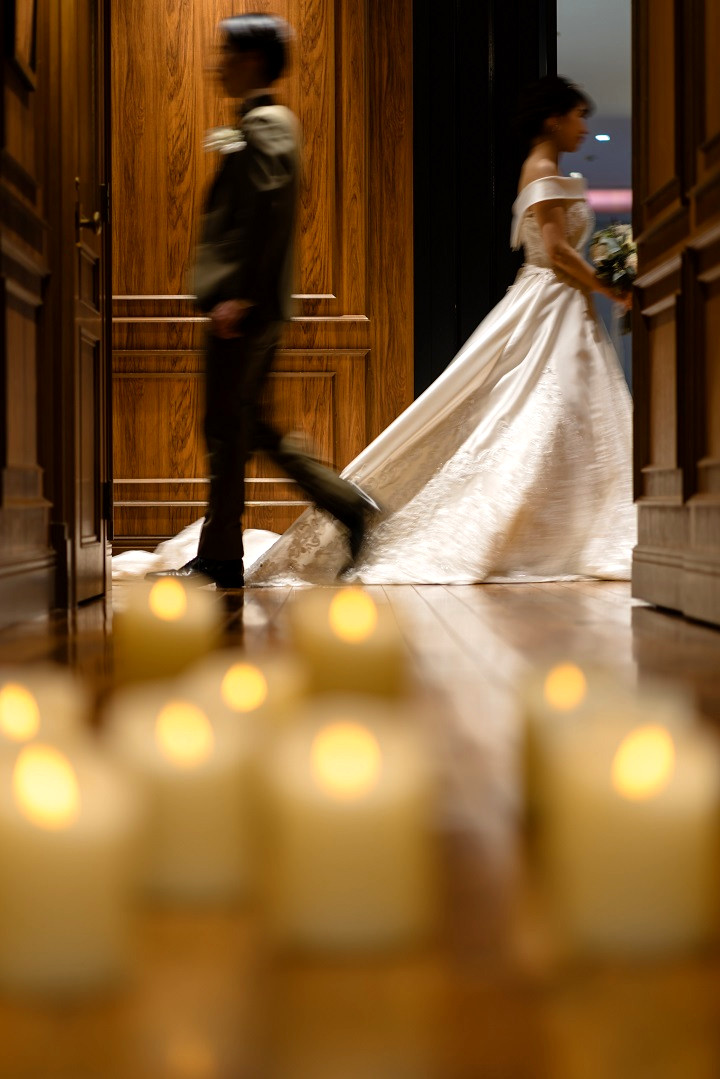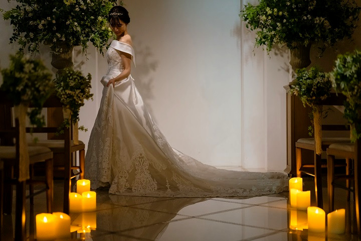 バージンロードにキャンドルを並べ、夜にしか出せないロマンティックな雰囲気・大人な雰囲気が魅力のナイトウエディング!